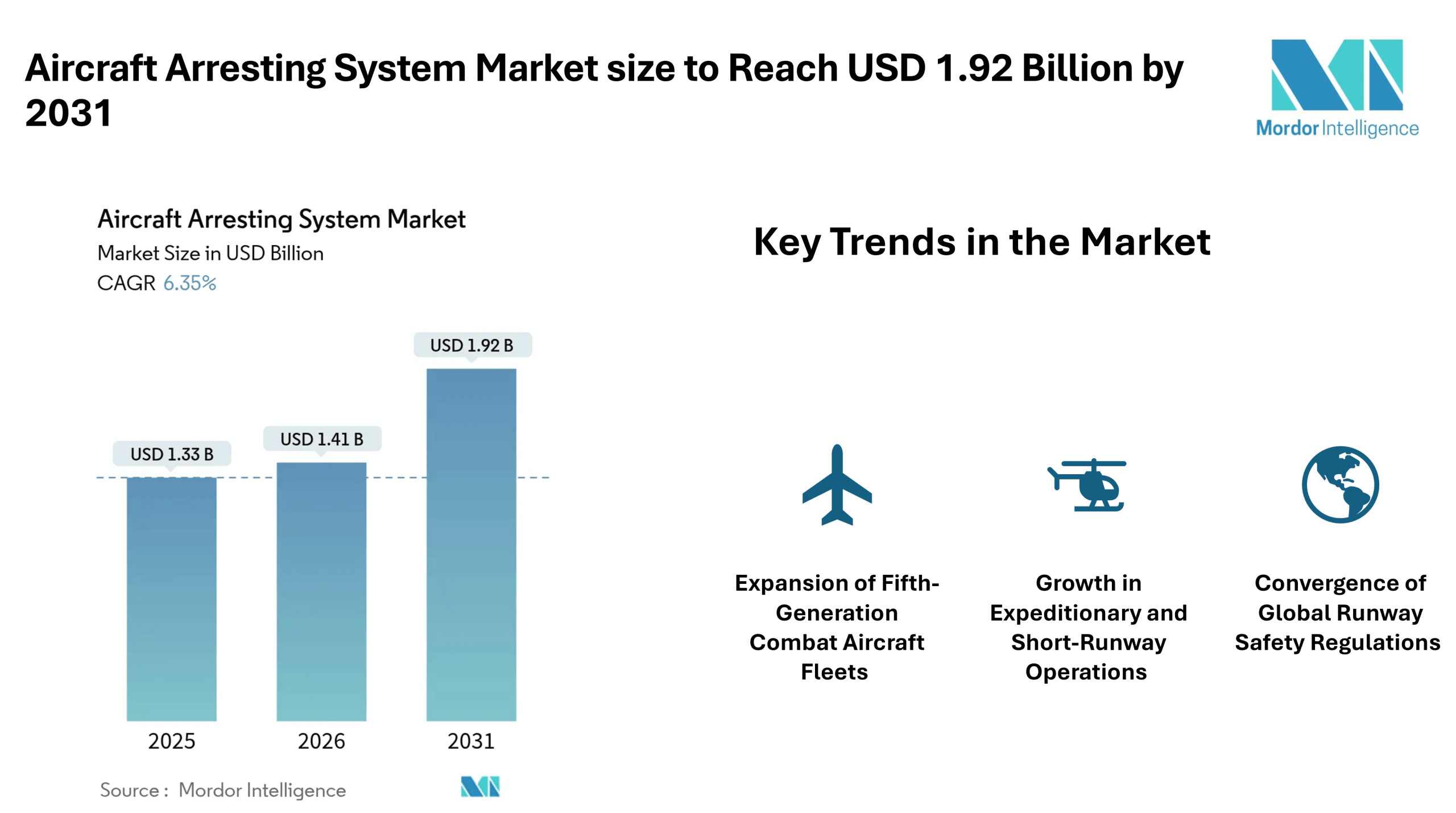 According to Mordor Intelligence, the aircraft arresting system market size was valued at USD 1.41 billion in 2026 and reach USD 1.92 billion by 2031, registering a CAGR of 6.35% during the forecast period. The aircraft arresting system market size is supported by rising investments in advanced fighter aircraft, aircraft carrier modernization programs, and stricter runway safety requirements across commercial airports.