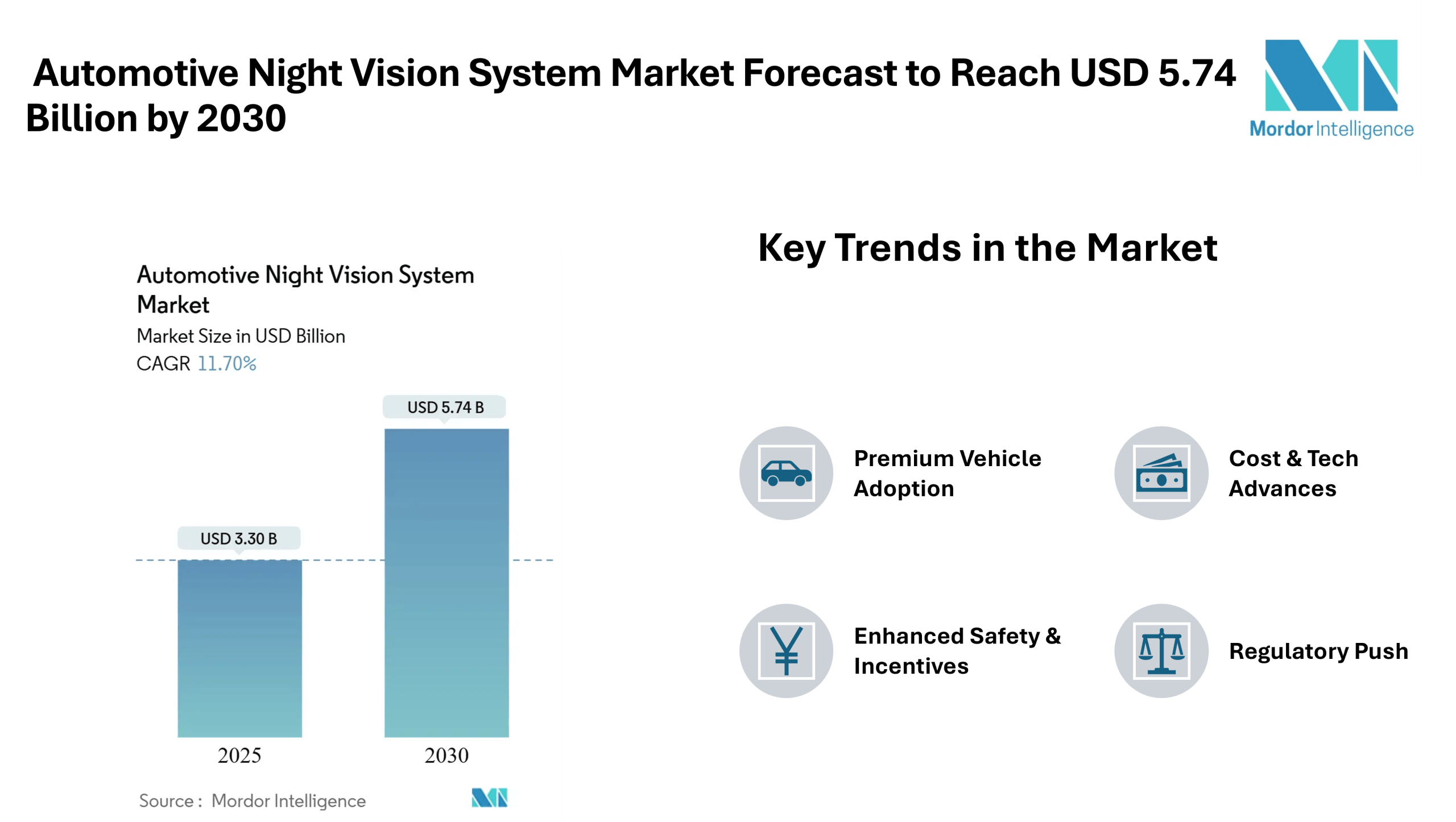 The automotive night vision system market is projected to grow from USD 3.30 billion in 2025 to USD 5.74 billion by 2030, registering a CAGR of 11.70%. Growth is driven by regulatory mandates for pedestrian protection, increasing adoption in premium battery-electric vehicles, and reductions in thermal imaging component costs. North America remains the largest market, while Asia-Pacific is poised to be the fastest-growing region. Automotive night vision systems are gradually transitioning from luxury add-ons to standard safety and compliance features, enhancing nighttime visibility and reducing accidents.