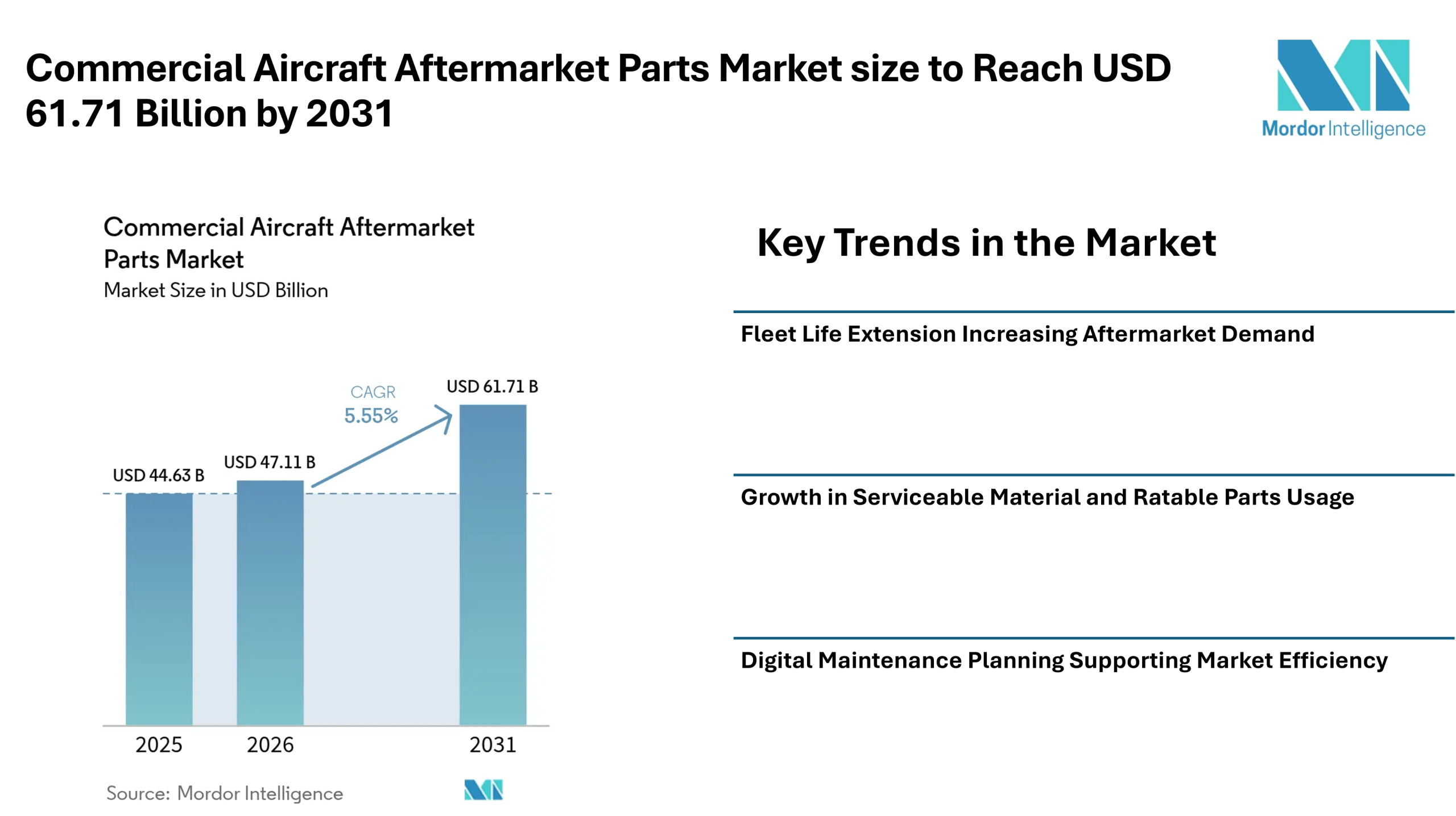 According to Mordor Intelligence, the commercial aircraft aftermarket parts market size is expected to increase from USD 44.63 billion in 2025 to USD 47.11 billion in 2026, with the commercial aircraft aftermarket parts market forecast indicating it will reach USD 61.71 billion by 2031. This steady rise reflects a consistent need for replacement parts, maintenance services, and lifecycle support across global airline fleets.