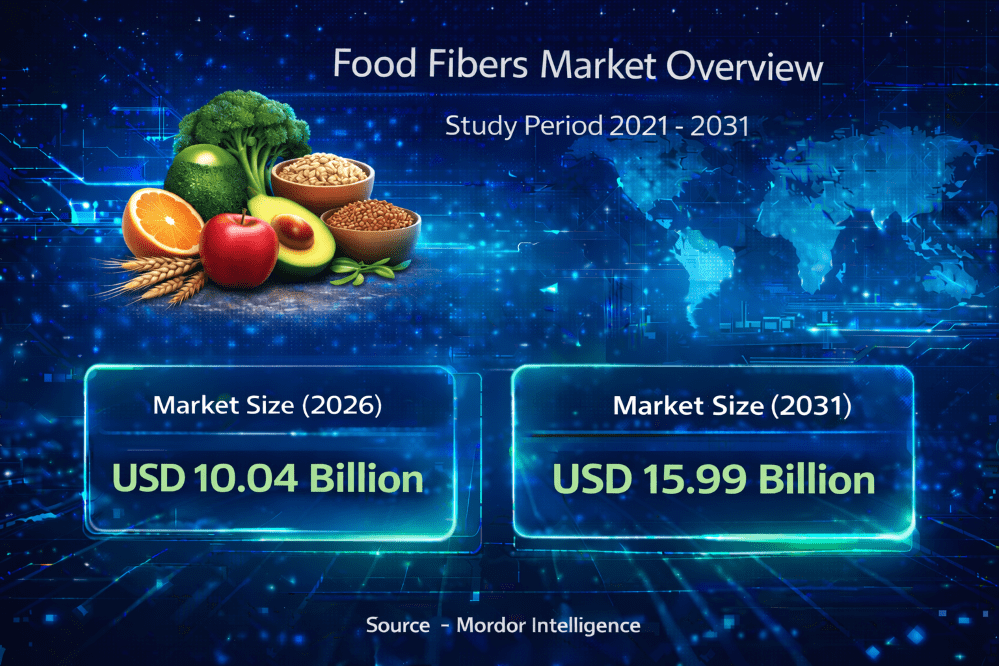 According to a research report by Mordor Intelligence, the global food fibers market size is projected to grow from USD 10.04 billion in 2026 to USD 15.99 billion by 2031, reflecting strong momentum during the forecast period. The expanding food fibers market growth is supported by increasing awareness of dietary fiber intake, sugar-reduction regulations, and rising consumer focus on gut health and metabolic wellness.