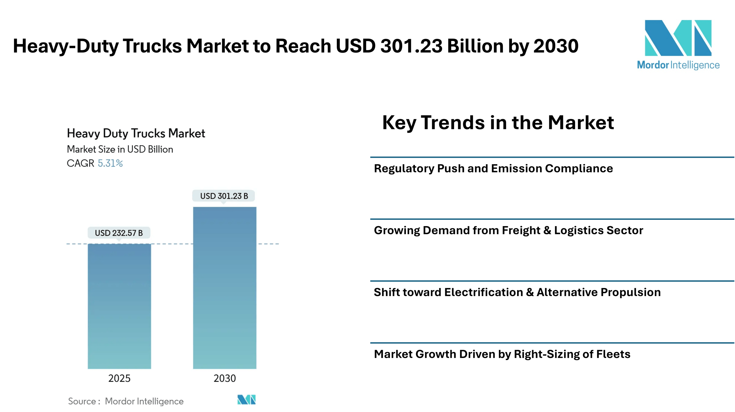 The heavy duty trucks market is valued at USD 232.57 billion in 2025 and is forecast to reach USD 301.23 billion by 2030, registering a 5.31% CAGR. As the demand for freight transport, logistics, and construction infrastructure continues to rise worldwide, the heavy duty trucks market is experiencing growth rooted in evolving buyer preferences, shifting regulations on emissions, and emerging powertrain technologies. In parallel, fleet owners are balancing legacy diesel platforms against nascent electric and zero-emission alternatives a development that is shaping long-term capital-allocation and procurement plans across regions.